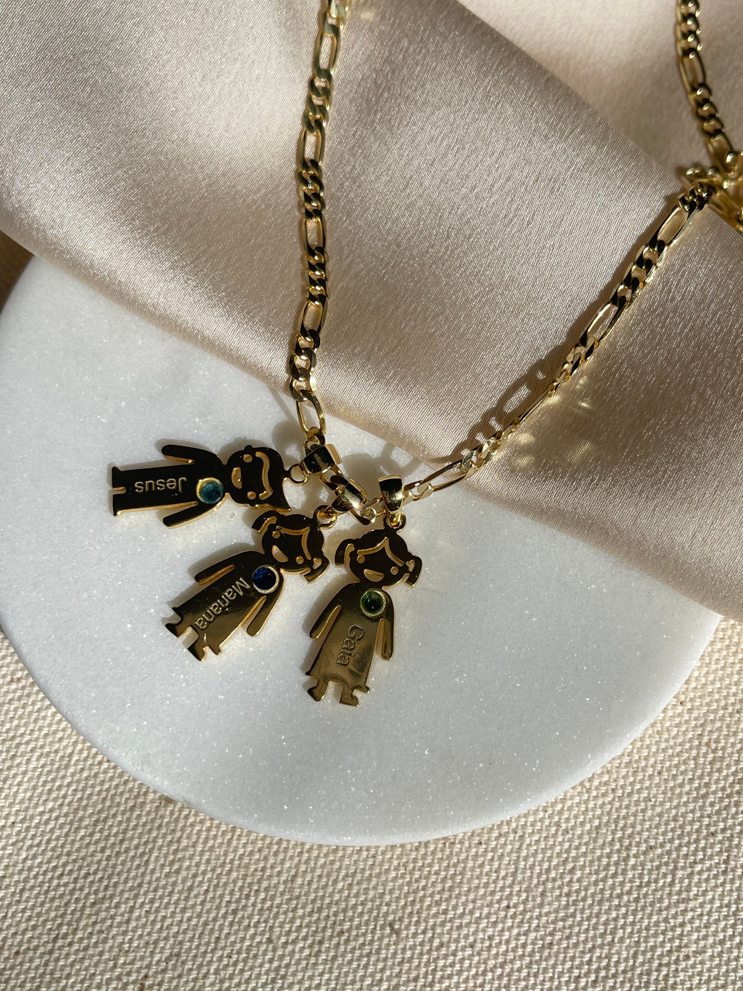 Custom Family Birthstone with Name Necklace. Select up to 5 Charms each with a personalized name and birthstone to match. Matched with our Figaro Chain